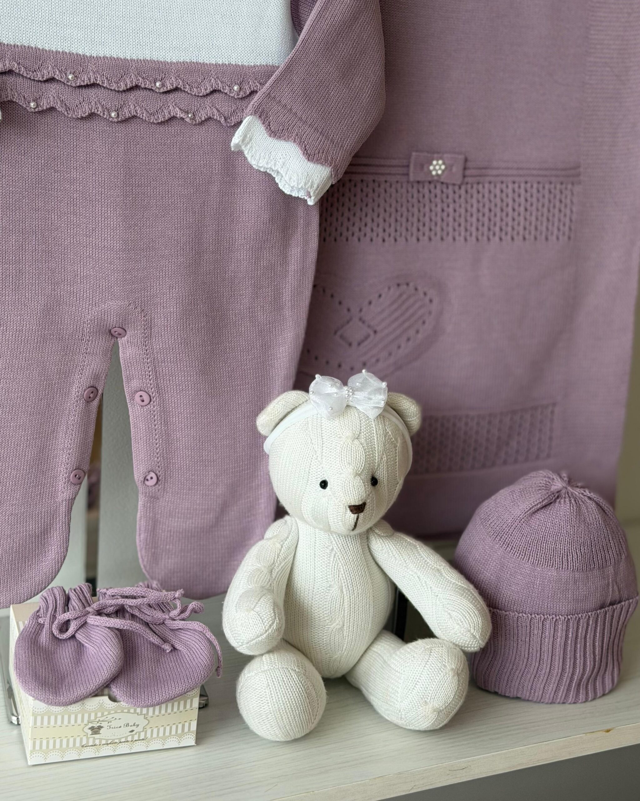 TAMANHO P: Corresponde de 0 a 3 meses COMPOSIÇÃO: 100% Acrílico ( ANTIALÉRGICA ) DESCRIÇÃO: A saída de maternidade Tricô Baby proporciona conforto e elegância ao seu bebê.